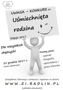 Zespół Interdyscyplinarny ds. Przeciwdziałania Przemocy w Rodzinie zaprasza do nadsyłania swoich prac na Konkurs Uśmiechnięta rodzina 2017. Prace mogą mieć formę rysunku, fotografii lub opowiadania/pracy literackiej.